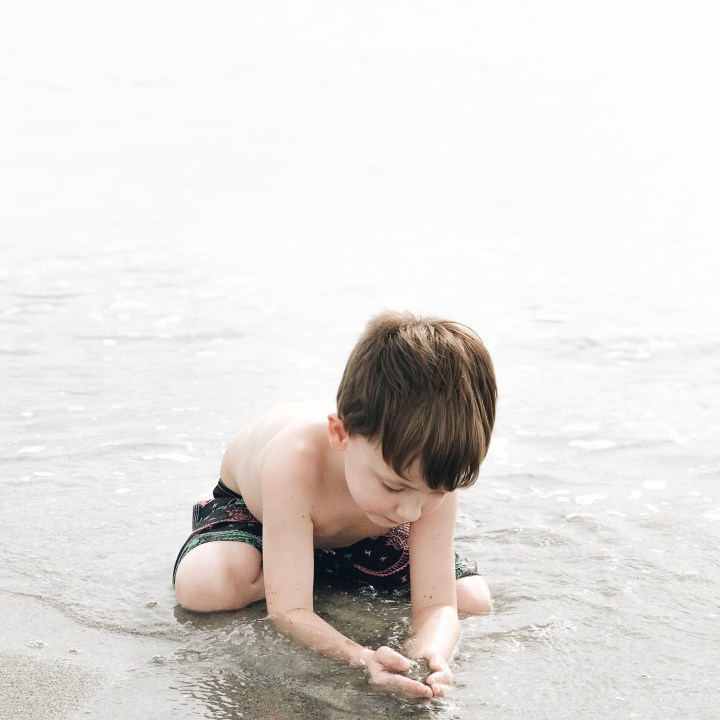 He cups his hands and stares intently at the swiftly sliding grains. The pressure of a wave steals what he is trying so hard to hold. “I’m looking for coquinas, Mama.”, he says.