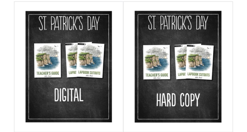 Gather ‘Round Homeschool St. Patrick’s Day mini unit ; available in both digital or hard copy. Includes a teacher’s guide and lap books for children (two levels available). This mini unit is designed to be completed over three days. It teaches the real history and symbolism behind St. Patrick’s Day.